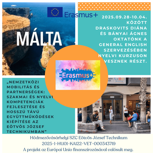 Intenzív nyelvi kurzus Máltán. A projekt az Európai Unio finanszírozásával valósulhatott meg. Hódmezővásárhelyi SZC Eötvös József Technikum 2025-1-HU01-KA122-VET-000343719